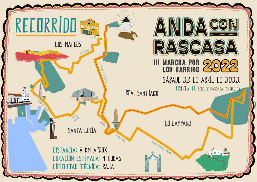 Una de las actividades ha sido la tercera marcha ‘Anda con Rascasa’ por los barrios de Los Mateos, Santa Lucía, Lo Campano y Barriada Santiago, una cita senderista de bajo nivel para propiciar la presencia masiva de participantes y que fuera una jornada de convivencia familiar… o en tropa, pues han sido unos doscientos los participantes, cifra que, quizás, hubiese aumentado ai a la hora de la salida (9.15 horas ante la sede de Rascasa en Los Mateos) no hubiese estado lloviendo.