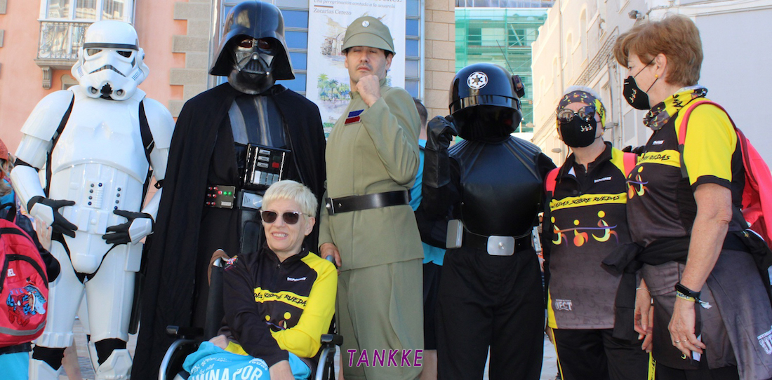 La vuelta de la ruta solidaria atrae a cientos de participantes, entre los que ha estado la alcaldesa, en un recorrido de cinco kilómetros marcado por el buen tiempo y un gran ambiente, como se refleja en esta imagen de integrantes del colectivo ‘Zancadas sobre ruedas’ con personajes de ‘La guerra de las galaxias’, entre los que figura el jedi que se pasó al lado oscuro. GALERÍA DE FOTOS DE TANKKE (pinchar aquí)