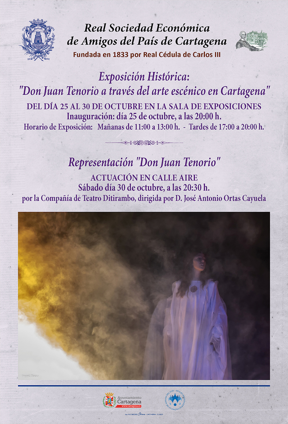 La sala de exposiciones de la Real Sociedad Económica de Amigos del País acoge desde el próximo lunes, a las 20 horas, la inauguración de la muestra histórica 'Don Juan Tenorio a través del arte escénico en Cartagena' a cargo de teatro Ditirambo, cuyos actores bajo la dirección de José Antonio Ortas representarán la obra el sábado día 30 en la calle del Aire, desde las 20.30 horas.