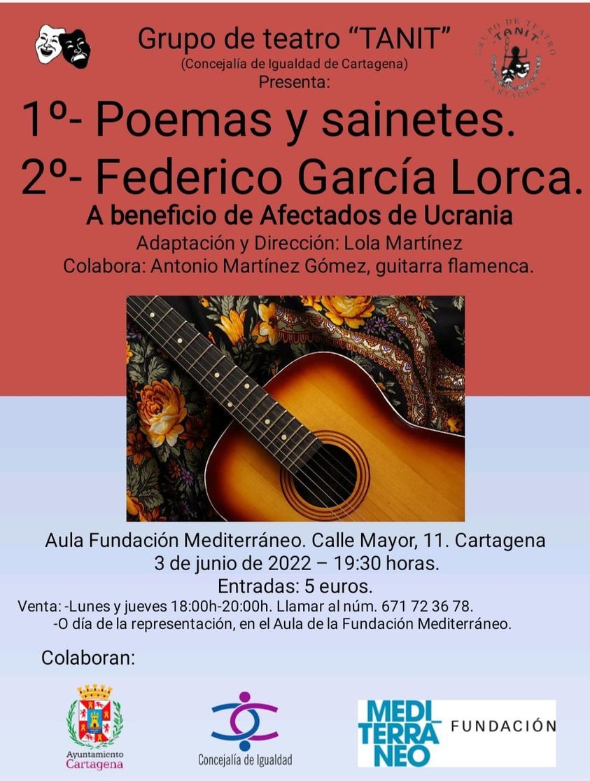 El grupo de teatro desarrolla este viernes, a las 19.30 horas, en el aula de la Fundación Mediterráneo de la calle Mayor: 1º Poemas y sainetes. 2º Federico García Lorca. Se trata de una adaptación dirigida por Lola Martínez con Antonio Martínez a la guitarra. La entrada cuesta 5 euros y el dinero se destinará a los afectados por la guerra generada por la invasión de Rusia a Ucrania.