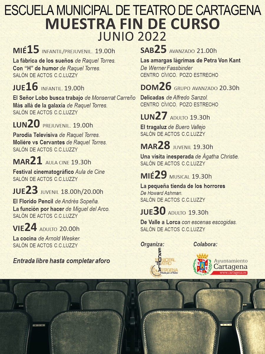La Escuela Municipal de Teatro de Cartagena realizará su tradicional muestra de final de curso a partir del próximo 15 de junio. Un total de 17 grupos, que interpretarán 16 funciones gratuitas, participarán en esta iniciativa en la que colabora Ayuntamiento.