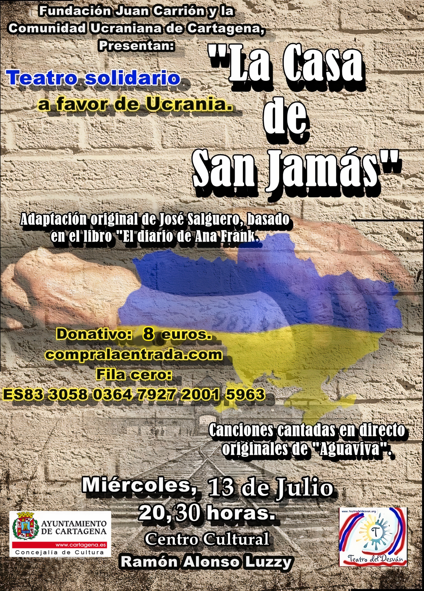 Se trata de una iniciativa impulsada por la Fundación Juan Carrión y la Asociación de Ucranianos de Cartagena, gracias a la colaboración del Ayuntamiento y del Grupo El Desván, quienes representarán esta función, enmarcada dentro del acto de final de curso 2021-22 de su Aula Taller de Teatro.