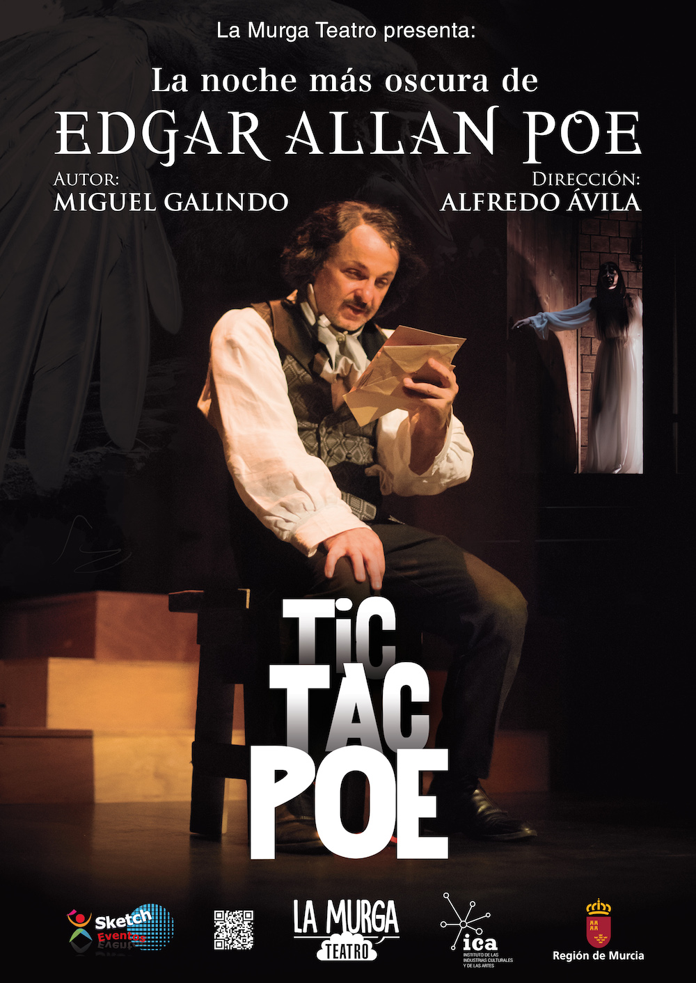 La obra está dirigida por Alfredo Ávila y la música es original de Miguel Ángel Marín y Pedro Contreras.SIPNOSIS: Edgar Allan Poe falleció con cuarenta años de edad. Su cuerpo fue encontrado sin vida el 7 de octubre de 1849 en una fría y oscura calle de Baltimore. Cómo y porqué llevó ahí. Es lo que muestra la obra que La Murga Teatro ha estrenado a nivel nacional en Cartagena, con una última noche del escritor, poeta y periodista. Entre el terror y el sufrimiento, el protagonista muestra sus obsesiones y miedos mientras entra en conversación con algunos de los personajes de sus habituales relatos cortos. Uno de ellos le desvelará que se encuentra dentro del popular juego 'Tic, Tac, Toe', también conocido en nuestro país por 'las tres en raya'. Además se le aparecerá el espíritu de Virginia, su esposa fallecida años atrás.