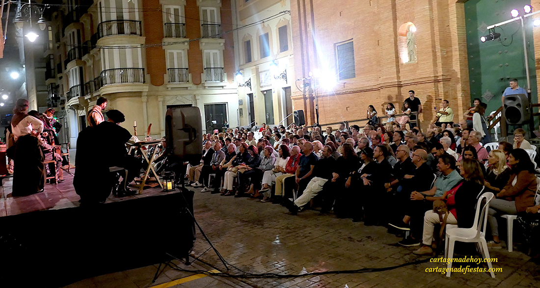 Una estupenda noche atrajo a más de doscientas personas a la calle del Aire de Cartagena para contemplar la representación de ‘Inés del alma mía’, adaptación del clásico de Zorilla de 1844 a cargo de la compañía ‘Ditirambo’, que hoy se traslada al Museo Arqueológico.