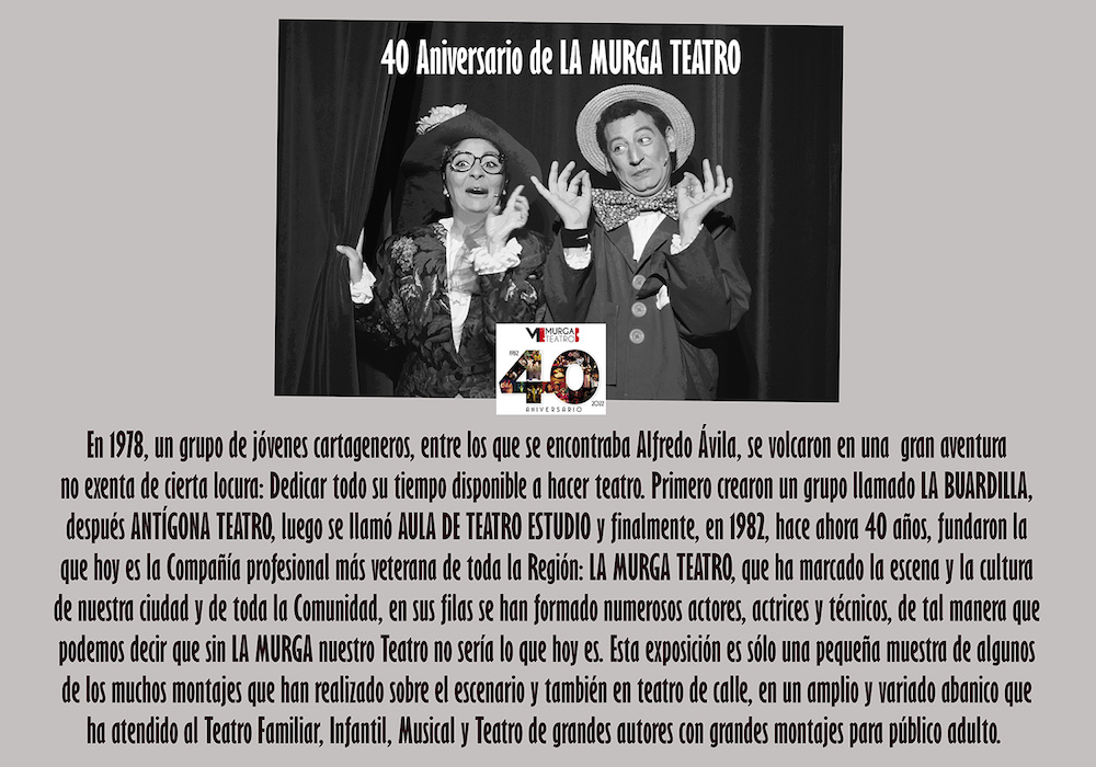 Durante este mes de diciembre se ha podido ver en la planta alta del centro municipal El Luzzy, la exposición del grupo teatral La Murga, comisariada por el artista cartagenero Javier Lorente, que recoge un centenar de fotografía y unos 20 paneles explicativos que ilustran la trayectoria, los montajes y los personajes de esta compañía comandada por el actor, dramaturgo y director Alfredo Ávila y la actriz y gestora Raquel Torres.