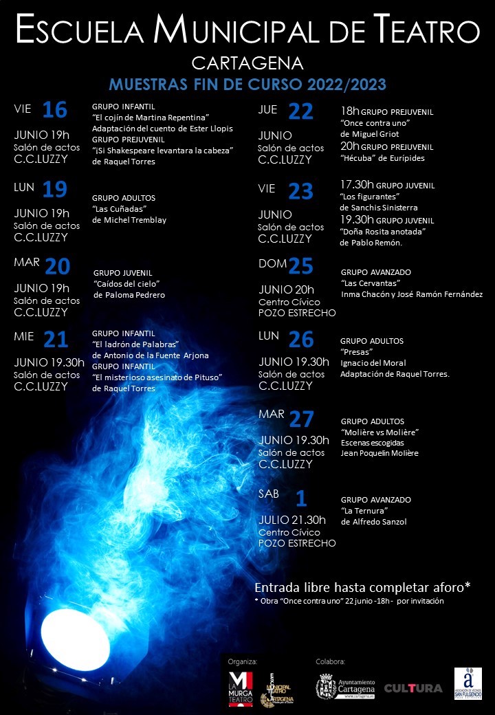 Los grupos infantil y prejuvenil, respectivamente, con las obras 'El cojí de Martina Repentina' y 'Si Shakespeare levantar la cabeza' han iniciado en El Luzzy las representaciones del cierre del curso 22/23, que continuará el lunes con 'Las cuñadas', a cargo del grupo de adultos, y que culminará el uno de julio en Pozo Estrecho con el grupo avanzando poniendo en escena 'La ternura'. Serán 14 representaciones (con entrada gratuita) en diez días con participación de unos doscientos alumnos.