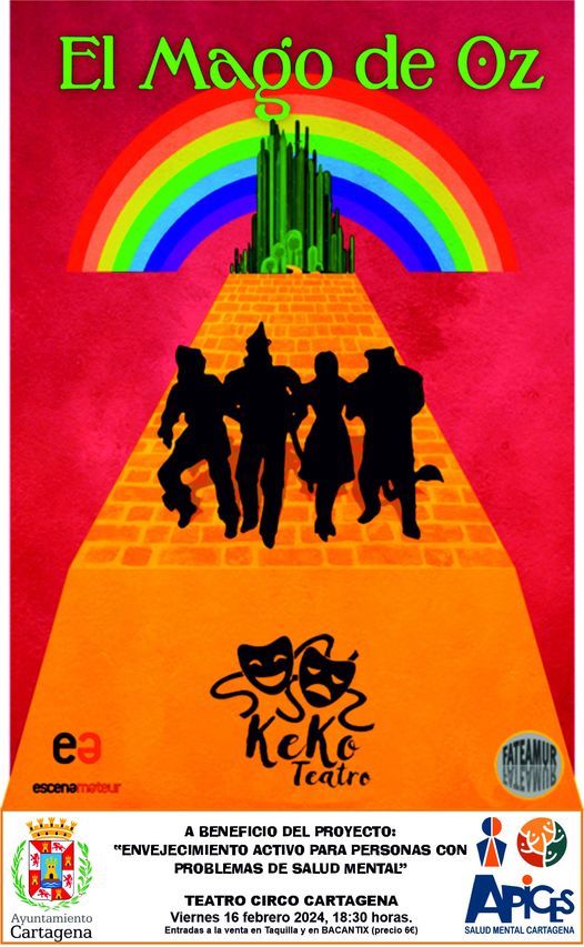 El próximo viernes 16 de febrero, a las 18:30 APICES Salud Mental Cartagena organiza la obra de Teatro El Mago de OZ. El evento se representará en el Nuevo Teatro Circo de Cartagena, gracias a la colaboración del Ayuntamiento de nuestra ciudad y a la compañía KEKO Teatro.
