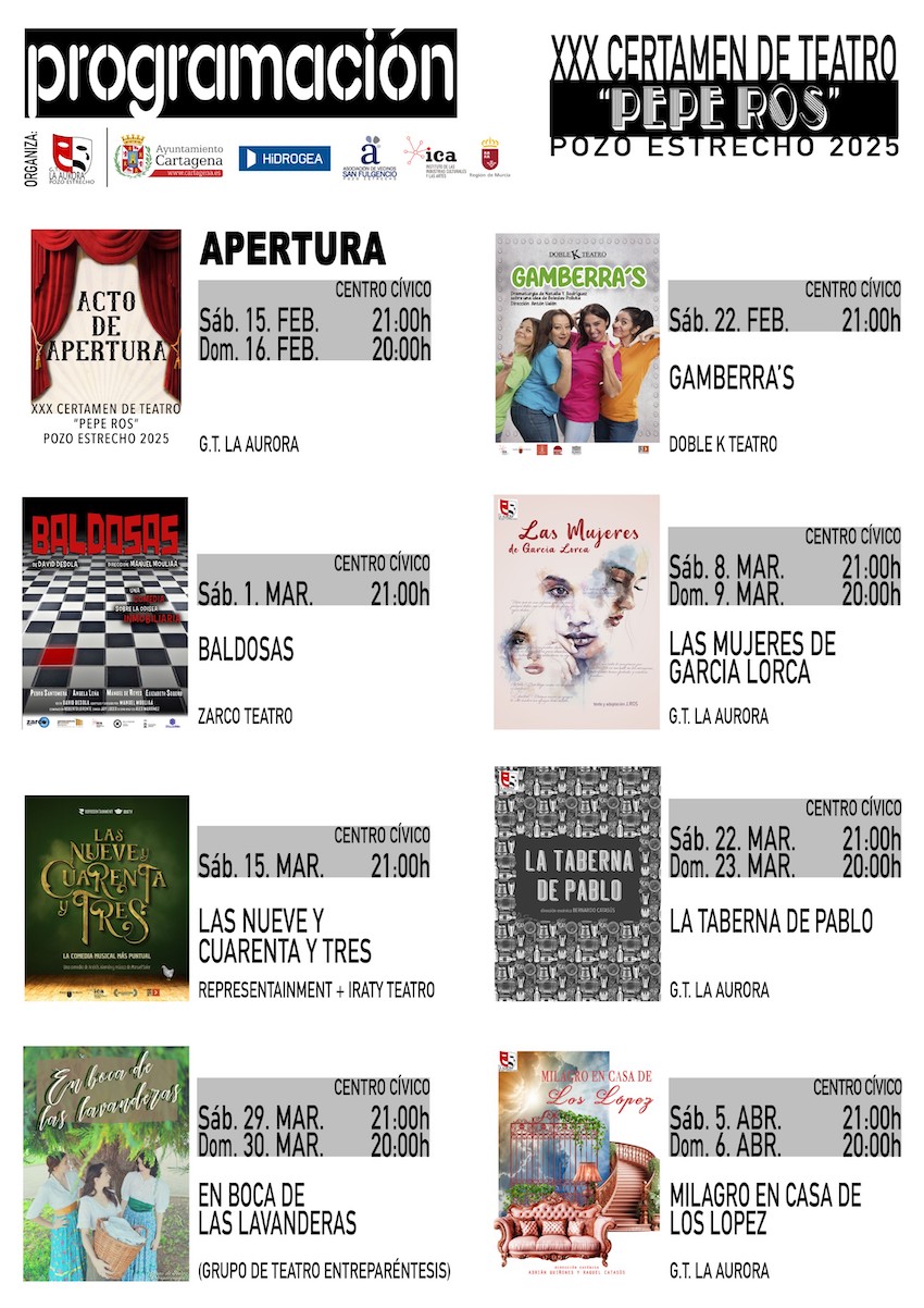 El Certamen de Teatro organizado por el Grupo La Auroa de Pozo Estrecho celebra este 2025 su 30ª edición con una importante novedad, ya que el concurso llevará el nombre de Pepe Ros, director de la asociación. La iniciativa, que cuenta con la colaboración del Ayuntamiento, se celebra del 15 de febrero al 6 de abril en el Centro Cívico de esta diputación.
