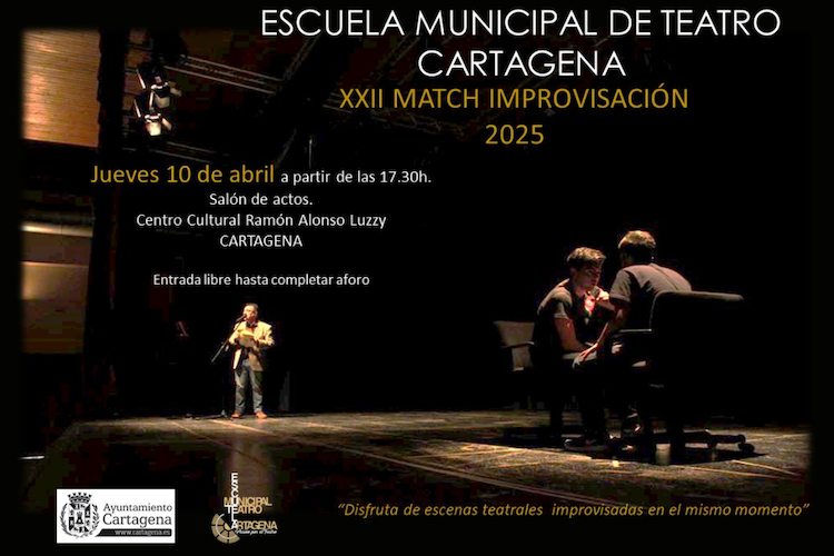 La Escuela Municipal de Teatro del Ayuntamiento de Cartagena celebra este jueves 10 de abril la XXII edición del Match de Improvisación. Este tradicional concurso cuenta con la participación de los alumnos de la escuela y mostrarán a los asistentes esta forma de hacer teatro en la que no hay guion. El evento se realizará a las 17:30 horas en el salón de actos del Centro Cultural Ramón Alonso Luzzy y la entrada es libre, hasta completar aforo.