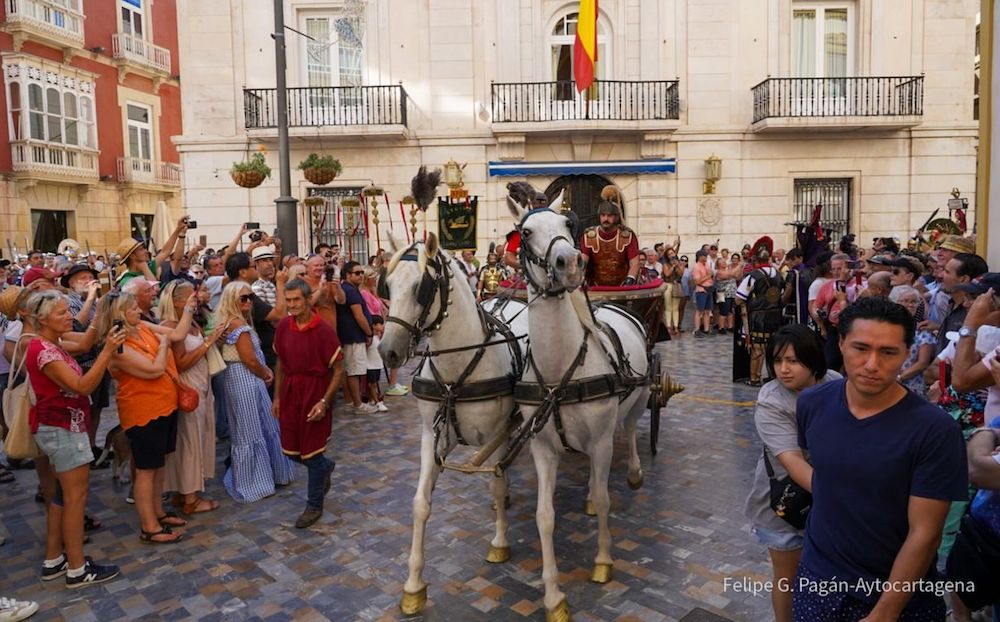 El gran combate de ayer tarde entre carthagineses y romanos tuvo un novedoso acto previo alejado del campo de batalla. Las legiones terrestres salieron desde la plaza de España y efectuaron una parada militar ante Capitanía General. Las fuerzas navales, por su parte, desembarcaron en el puerto y se dirigieron a la plaza de San Francisco.