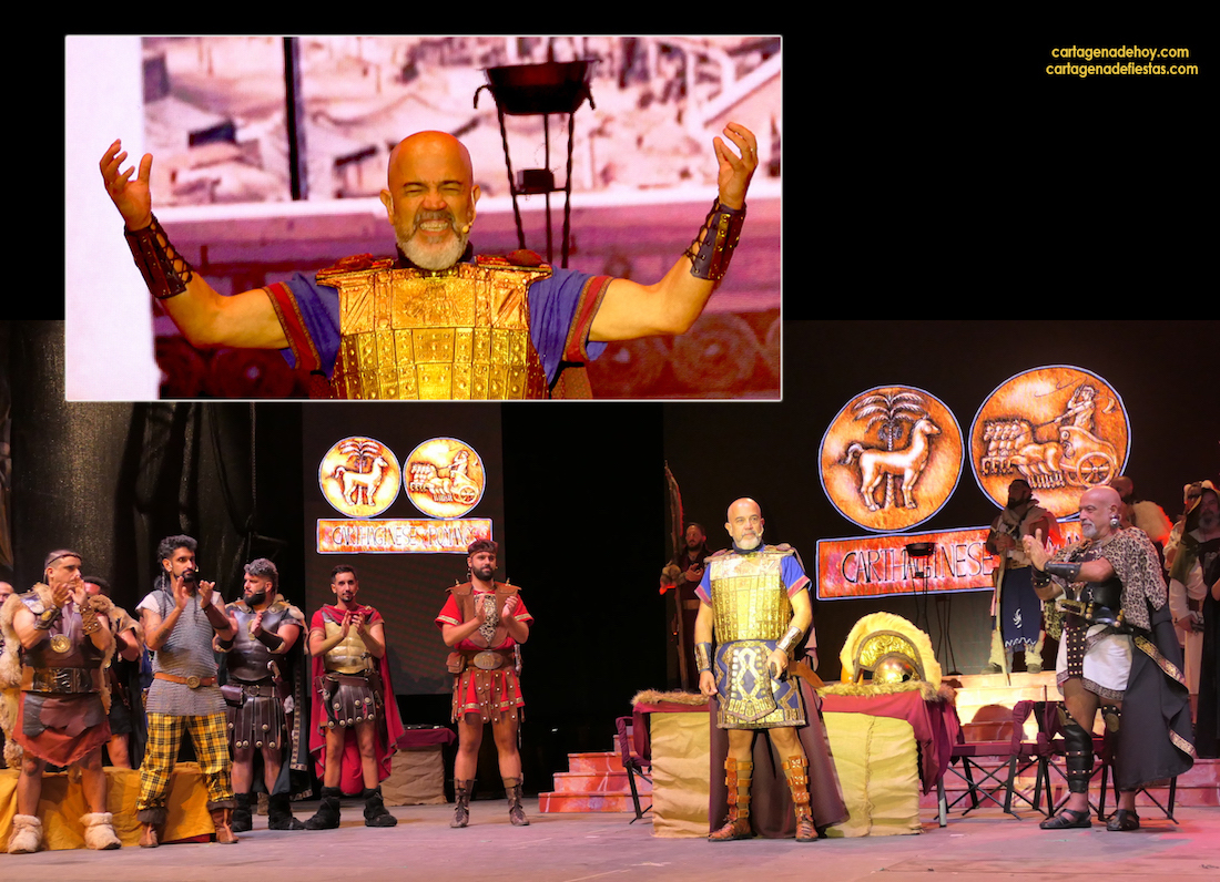 Aníbal convence a los almirantes de las fuerzas navales y a los caudillos de las tribus íberas para que lo acompañen en su osado plan de ir con un gran ejército a Roma cruzando los Pirineos y los Alpes. La obra, que duró cincuenta minutos, potenció su faceta interpretativa y tuvo la novedad de incorporar una escena cinematrográfica. En la imagen, Víctor Nieto (Aníbal) en la escena final y poco después, cuando fue aplaudido por todos en su despedida en el escenario del papel del estratega. GALERÍA DE FOTOS (pinchar aquí)